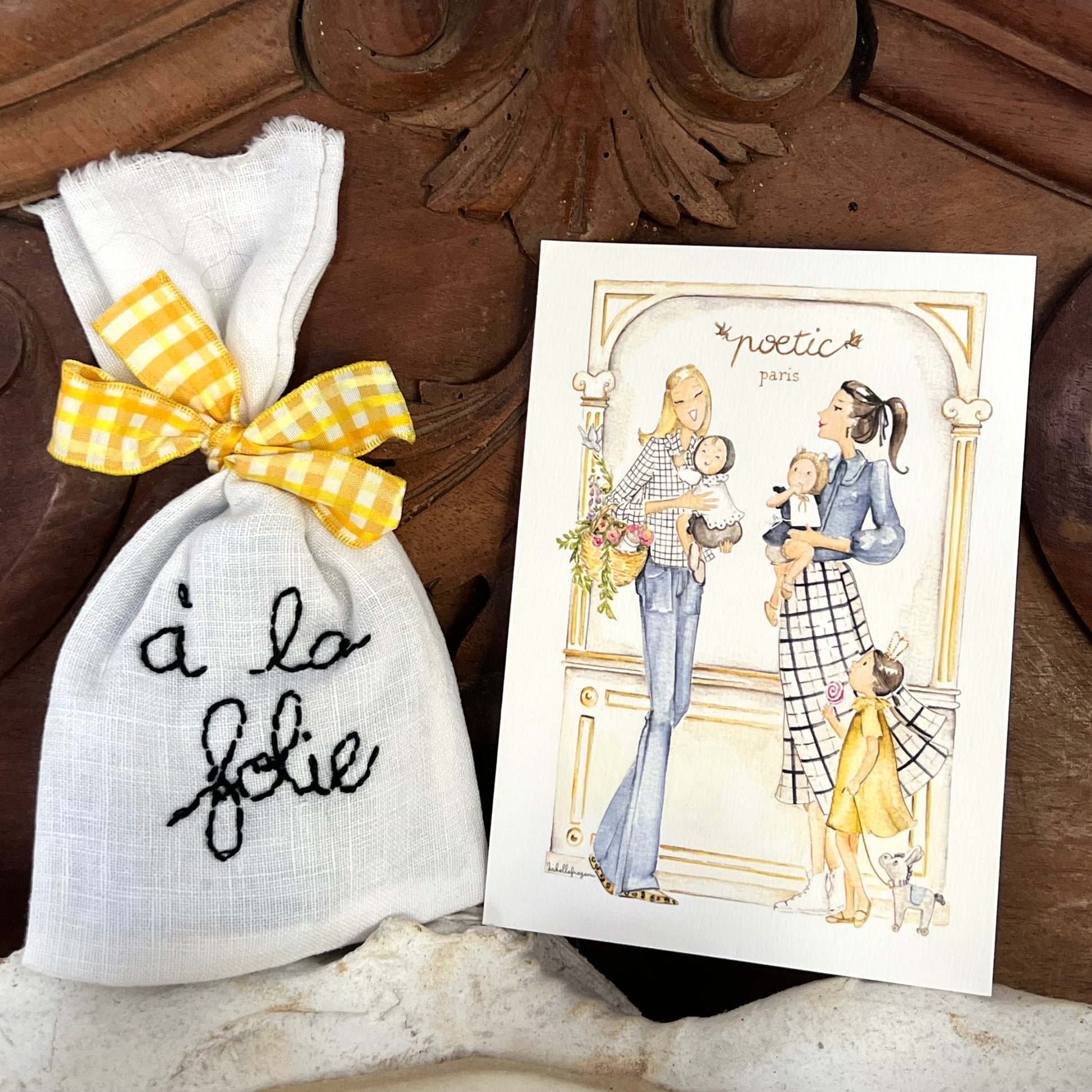 Vendu dans un petit pochon en lin blanc, cousu à la main au fil doré, brodé À la Folie, siglé p.o.e.t.i.c paris et noué avec un ruban ancien en vichy jaune.