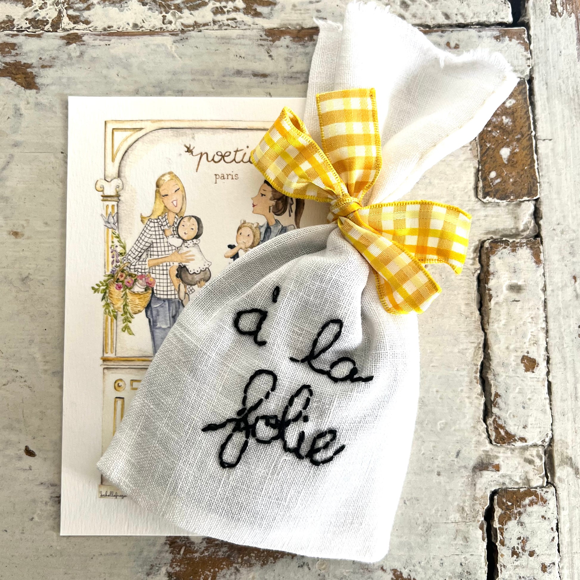 Vendu dans un petit pochon en lin blanc, cousu à la main au fil doré, brodé À la Folie, siglé p.o.e.t.i.c paris et noué avec un ruban ancien en vichy jaune.