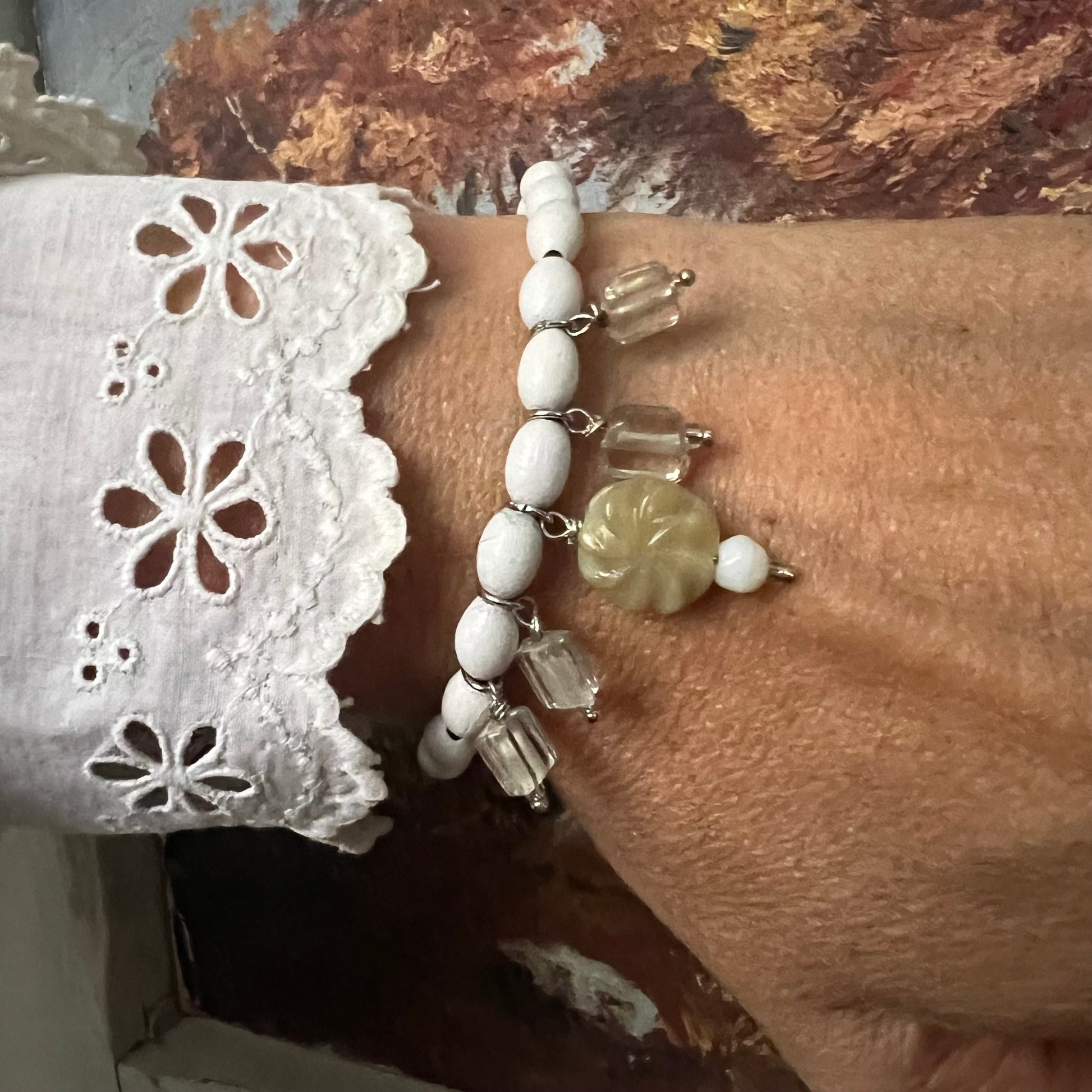 Des perles de bois peintes chinées comme du bois flotté trouvé sur la Plage et des petites perles éclats de Verre également vintage au milieu desquelles trône une breloque comme un Coquillage, le bracelet Summer sent bon la Plage, le Farniente.